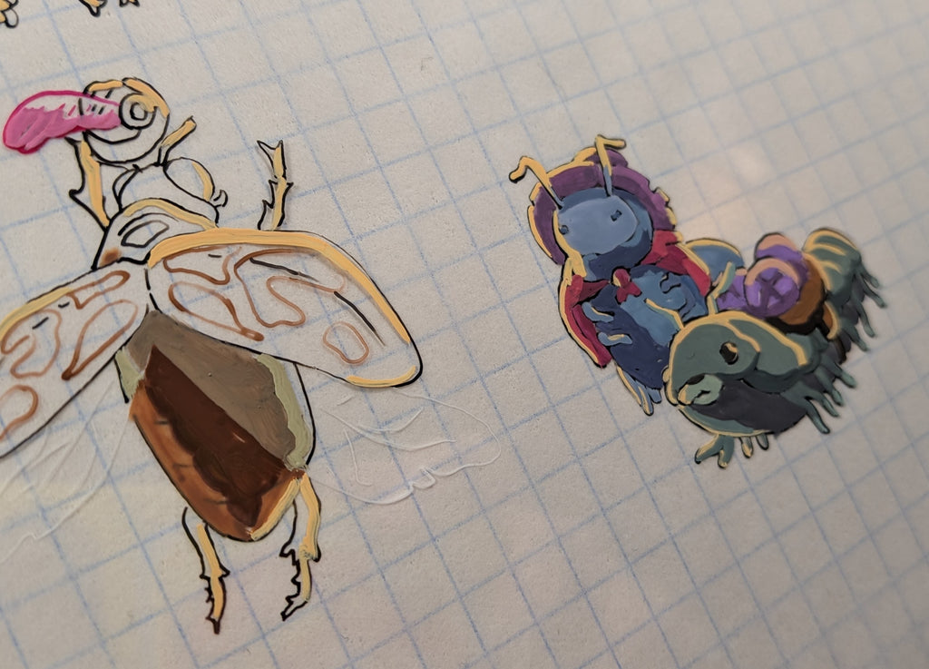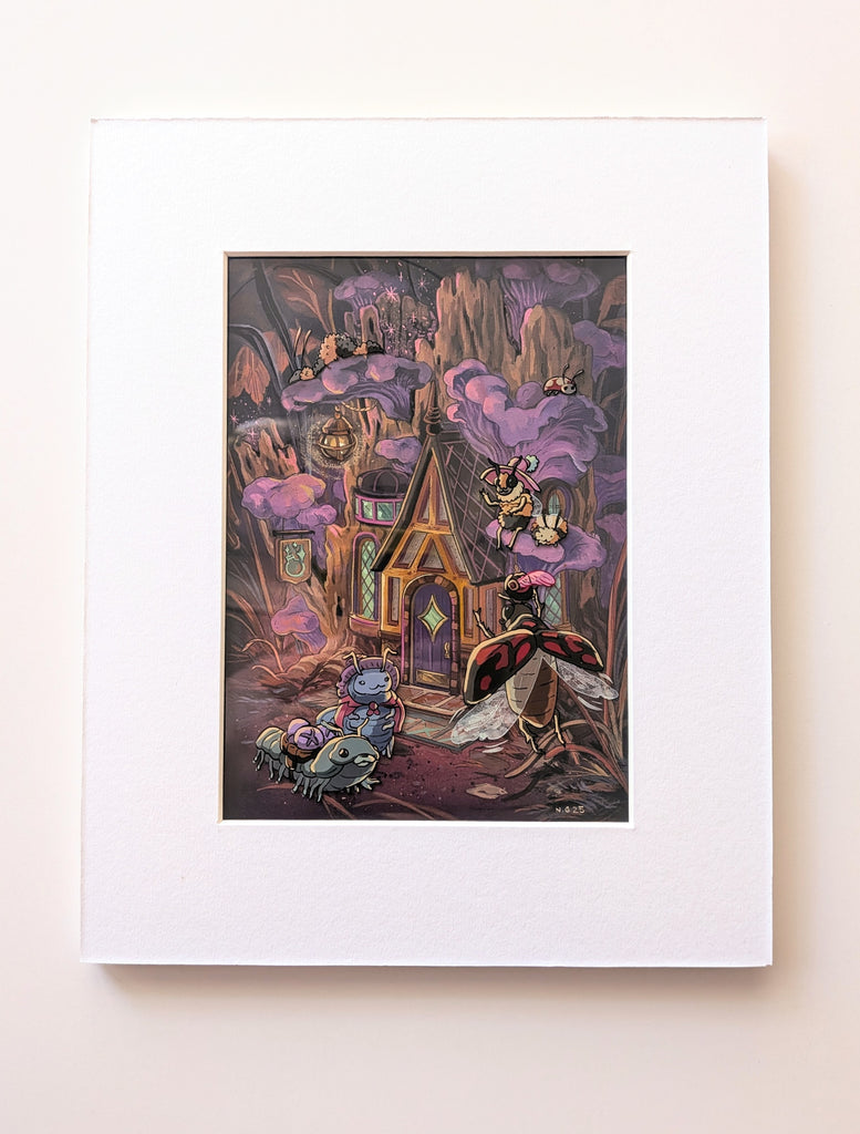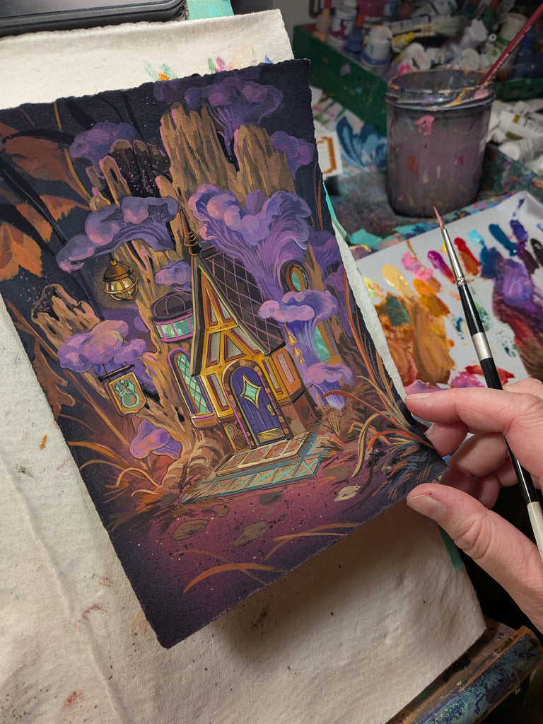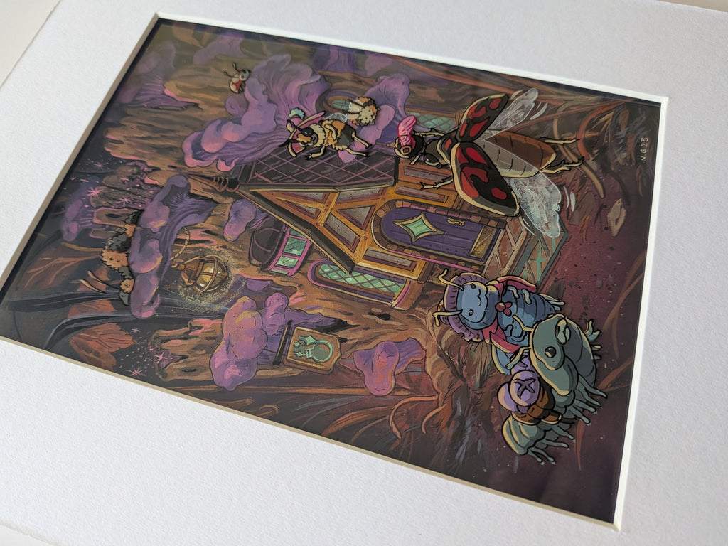 Painting featuring a fantasy apothecary shoppe with magical bug friends shopping. The background is painted on a watercolor paper with all the characters painted on a clear duralar to mimic traditional animation effect.
