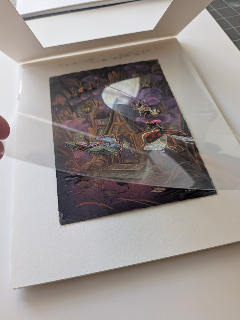 Matted with archival mat board and backing to keep the two layers of painting alligned.