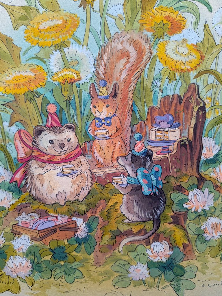Painting featuring a group of animals enjoying a slice of cake together. Hedgehog, squirrel and shrew surrounded by dandelion flowers and clover.