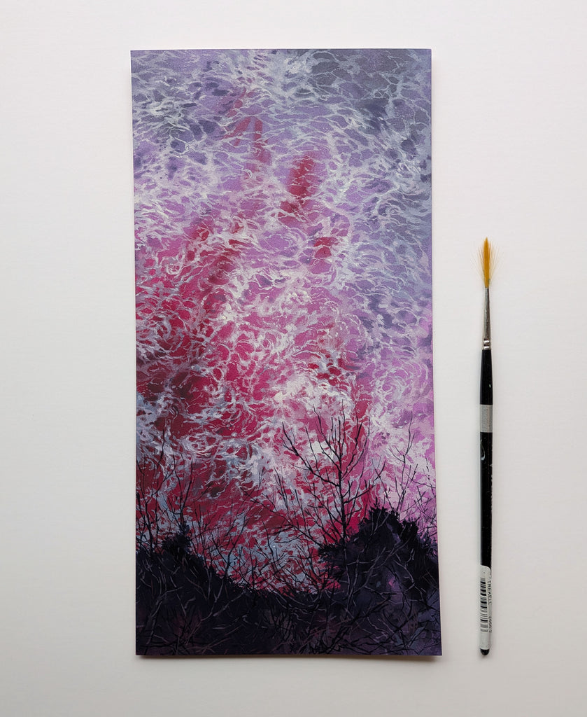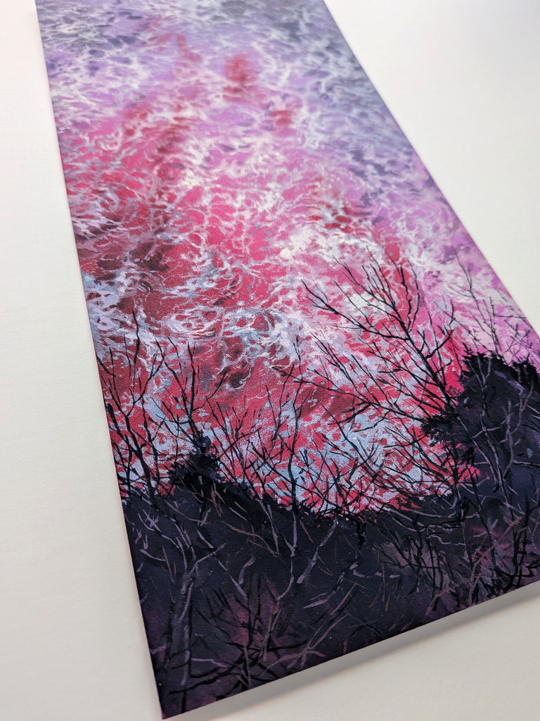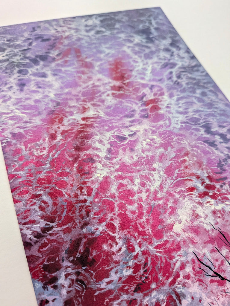 This original painting features red and lavender waves against dark hills and brush. An ode to haunted seaside tales.