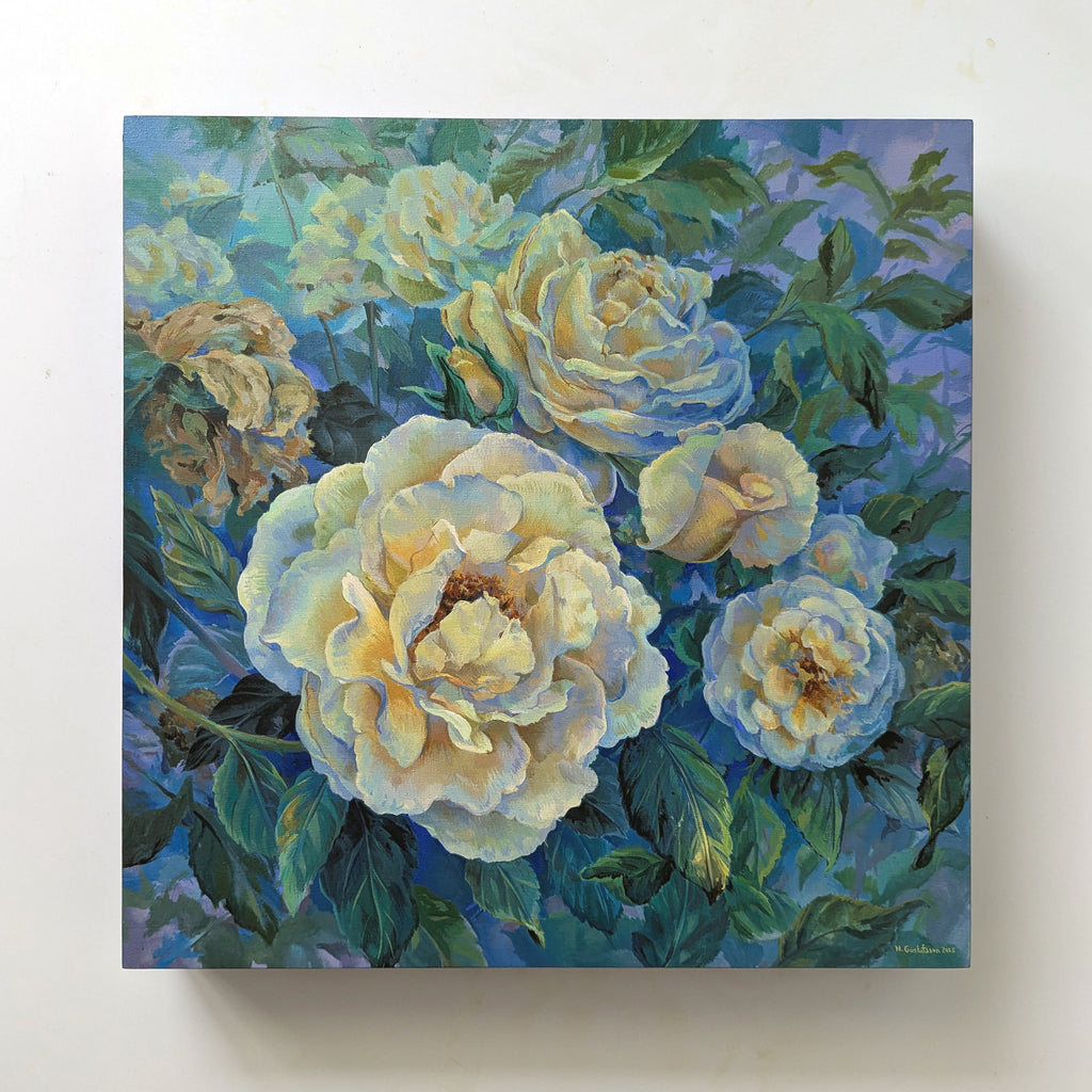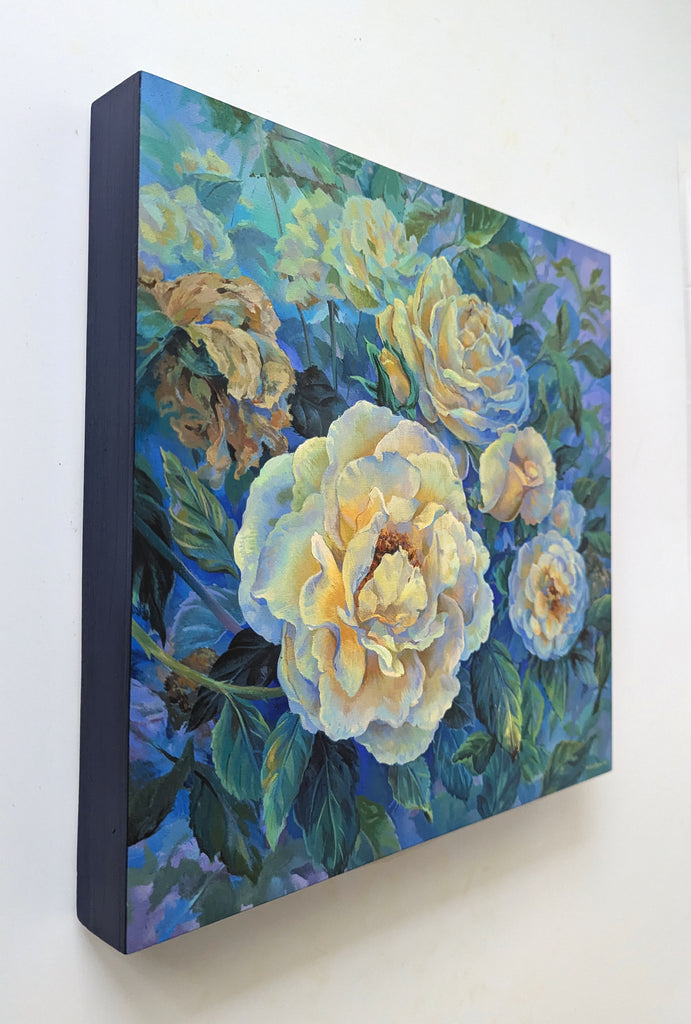Original Painting on wood panel, featuring pale yellow roses with green foliage. Inspired by roses in Nicole's garden at dusk.
