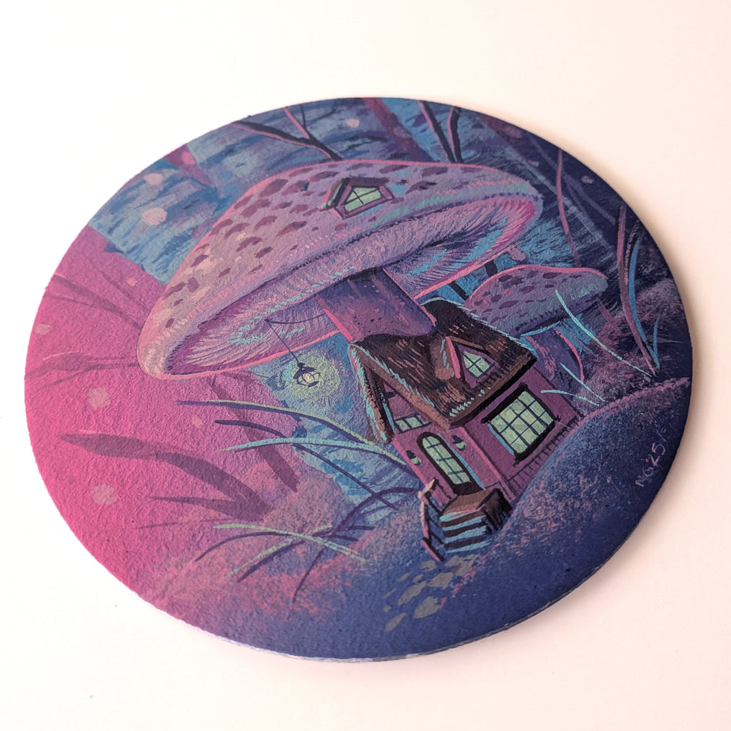 Media: Acryla Gouache and airbrush on circle paper coaster
