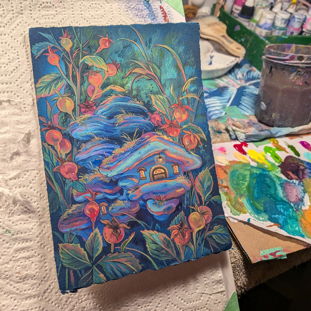Rose Hip Mushroom House - Original Painting by Nicole Gustafsson